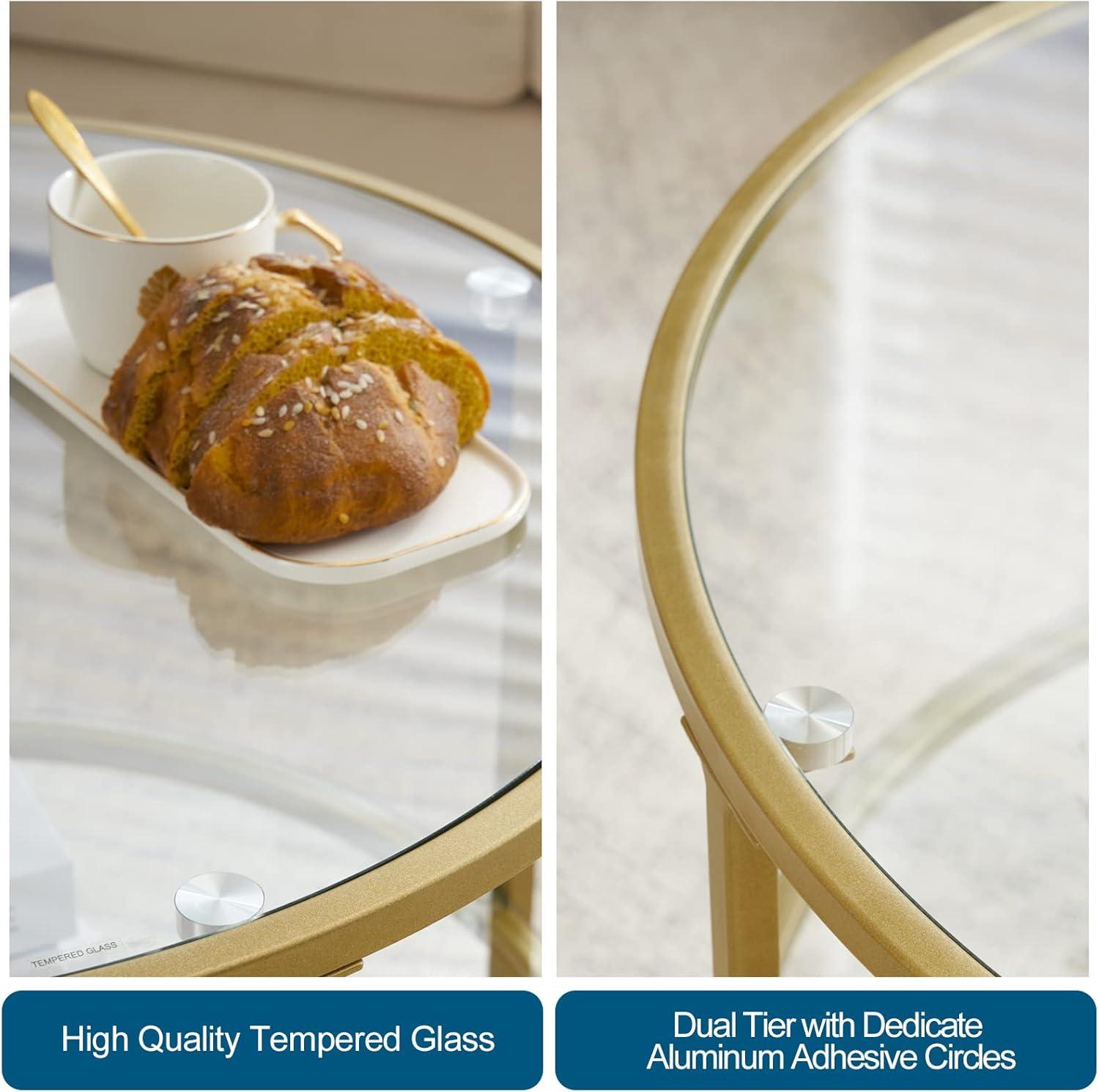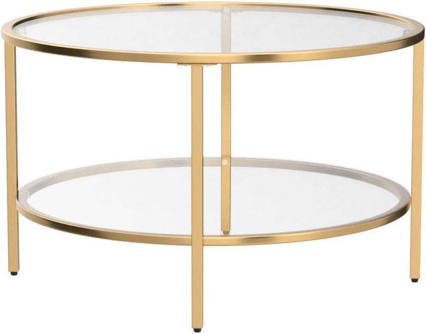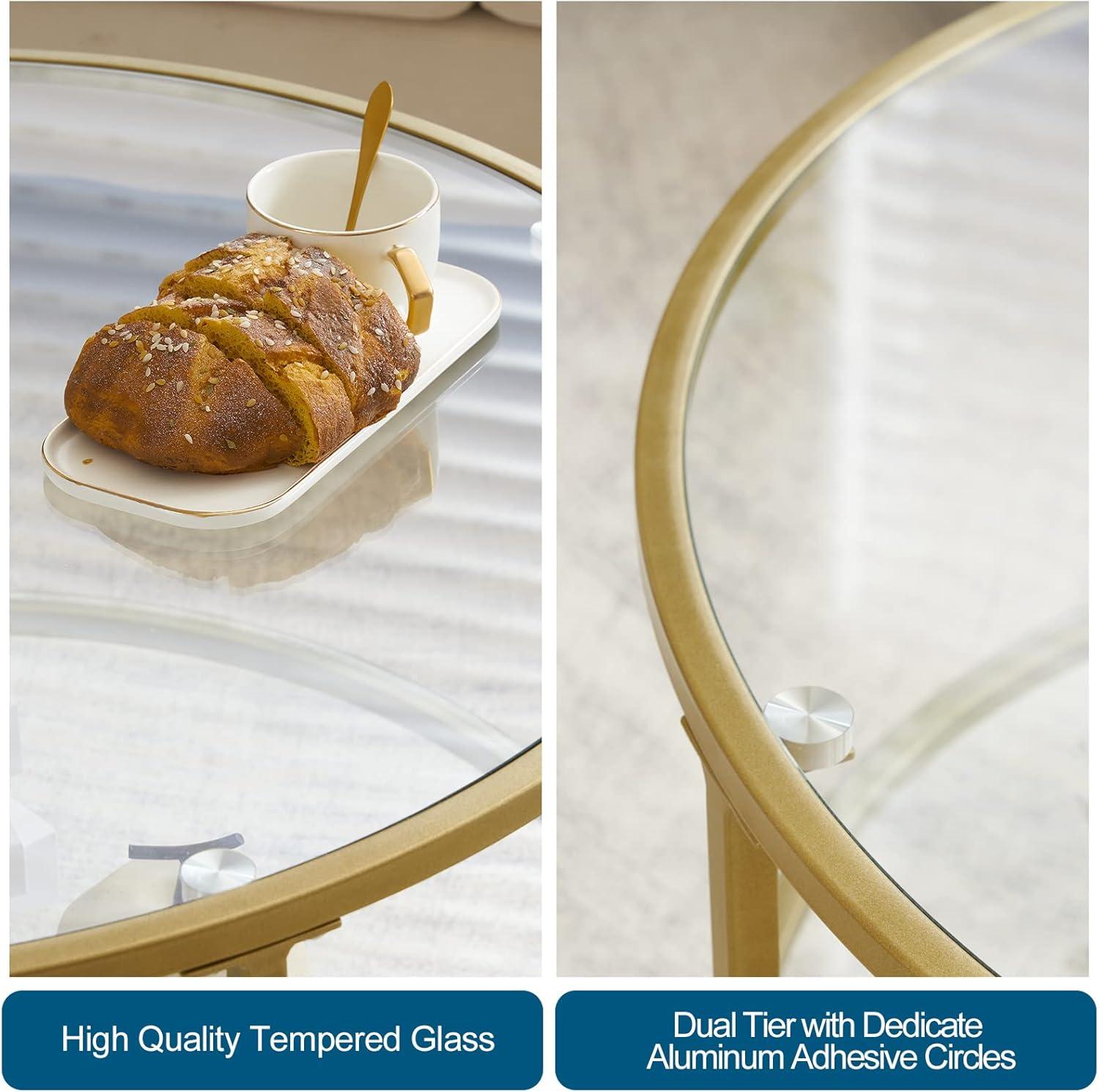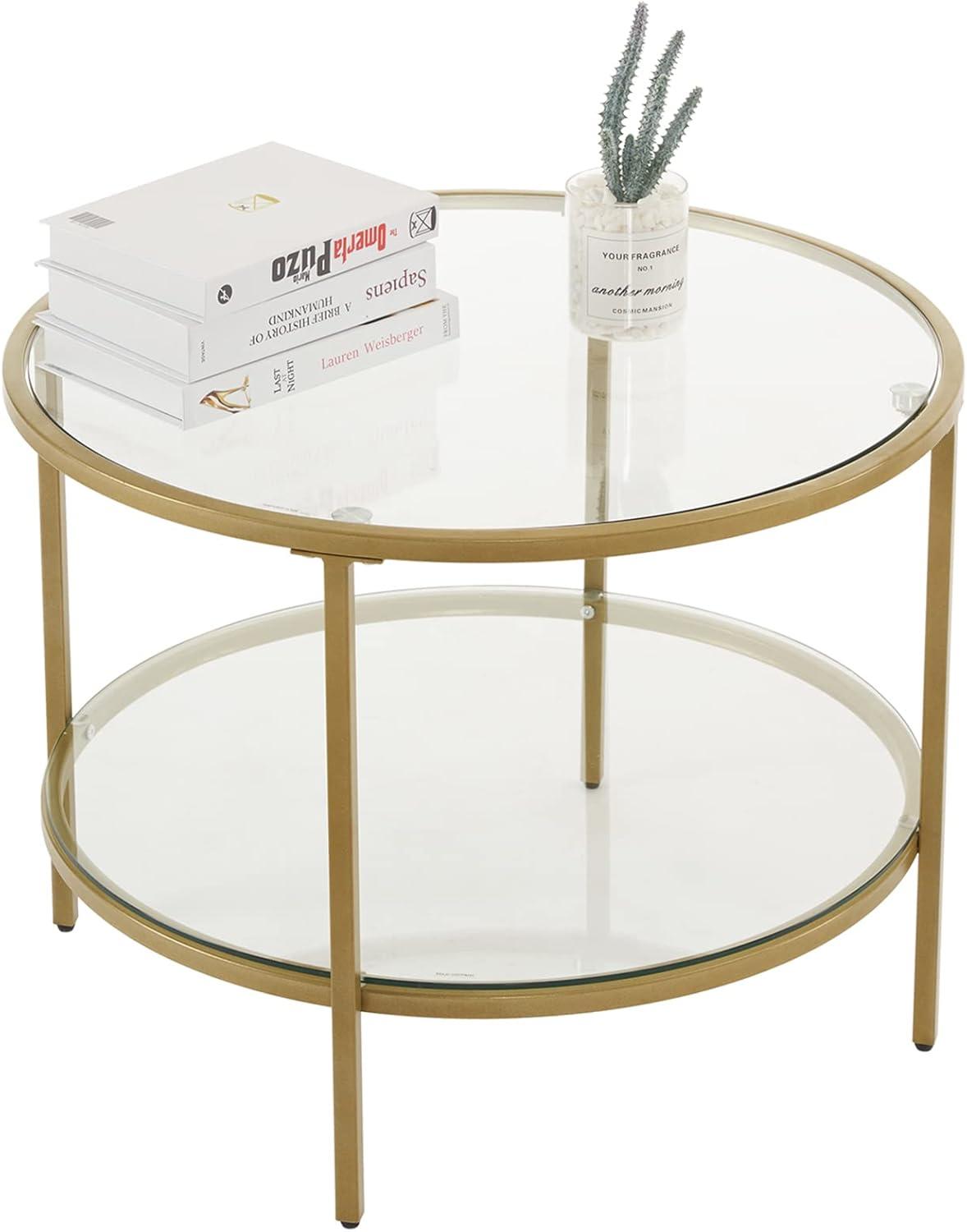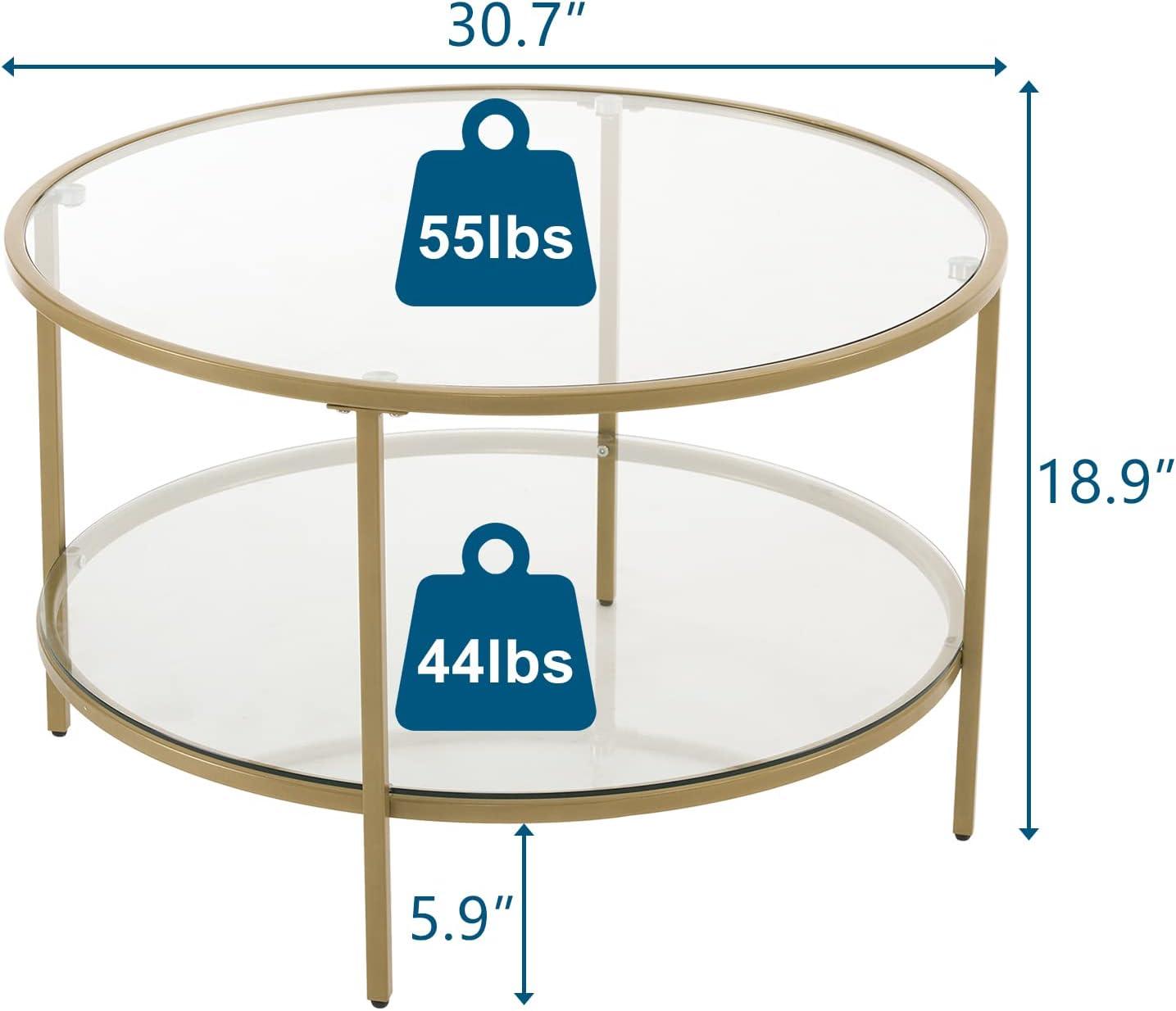 VINGLI 25.6" Small Matte Black Round Coffee Table Water-Wave Glass Circle Clear Coffee Table, Center Table with 2-Tier Modern Storage Design for Living Room, Bedroom, Meeting Room, Balcony, Patio(Clear-champagne Gold)
