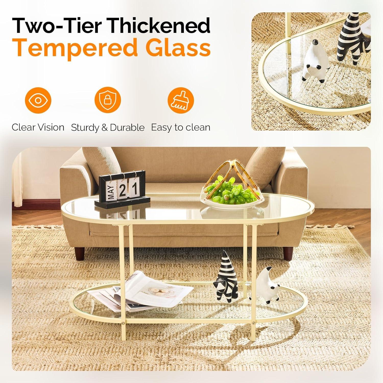 VINGLI 25.6" Small Matte Black Round Coffee Table Water-Wave Glass Circle Clear Coffee Table, Center Table with 2-Tier Modern Storage Design for Living Room, Bedroom, Meeting Room, Balcony, Patio(Clear-oval Beige)