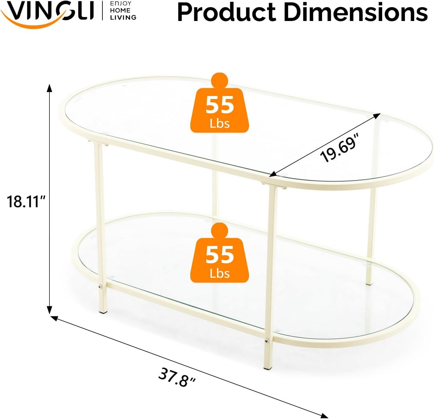 VINGLI 25.6″ Small Matte Black Round Coffee Table Water-Wave Glass Circle Clear Coffee Table, Center Table with 2-Tier Modern Storage Design for Living Room, Bedroom, Meeting Room, Balcony, Patio(Clear-oval Beige)