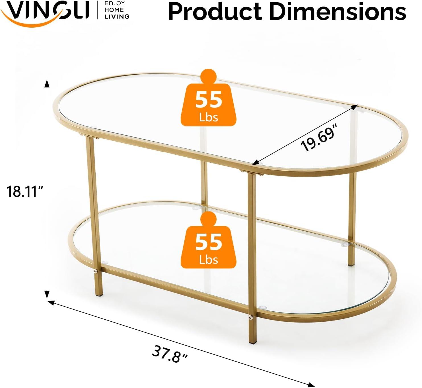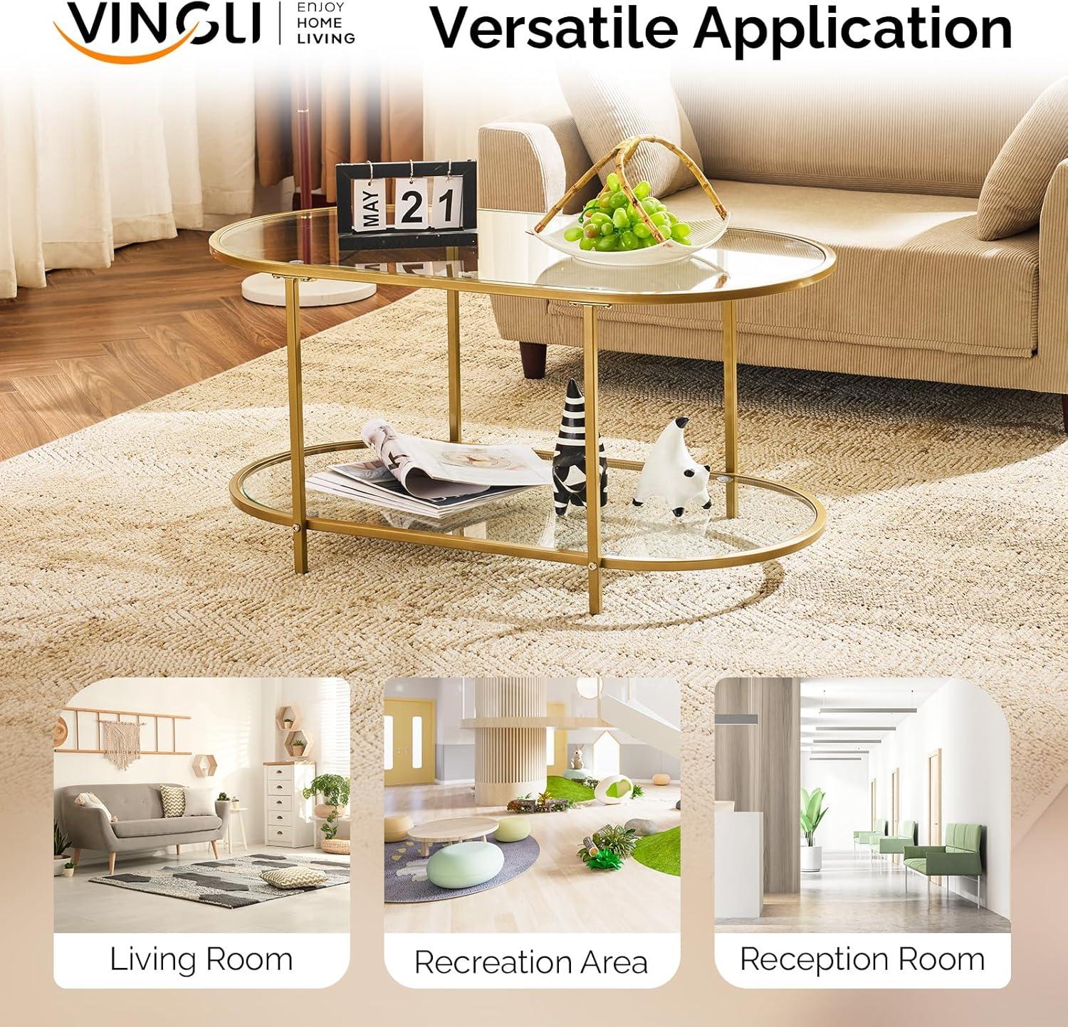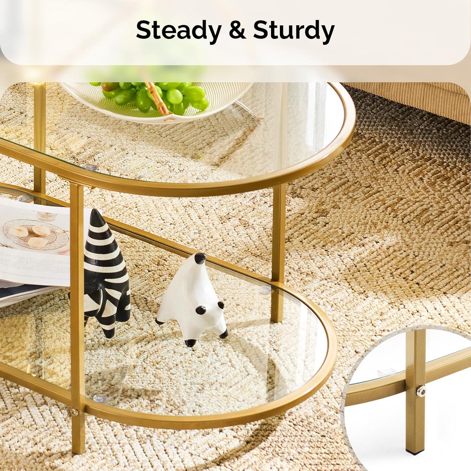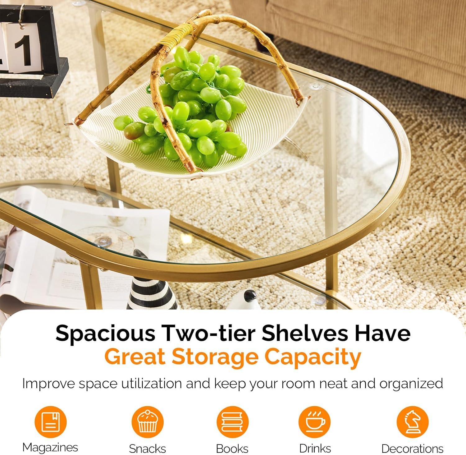 VINGLI 25.6″ Small Matte Black Round Coffee Table Water-Wave Glass Circle Clear Coffee Table, Center Table with 2-Tier Modern Storage Design for Living Room, Bedroom, Meeting Room, Balcony, Patio(Clear-oval Bright Gold)