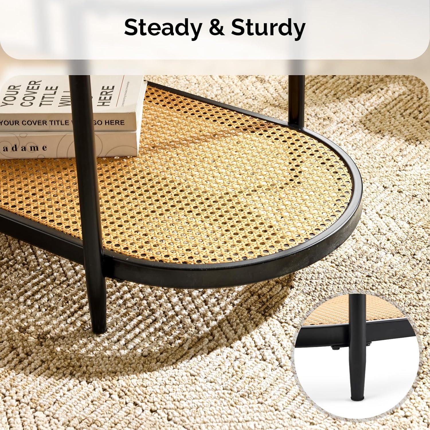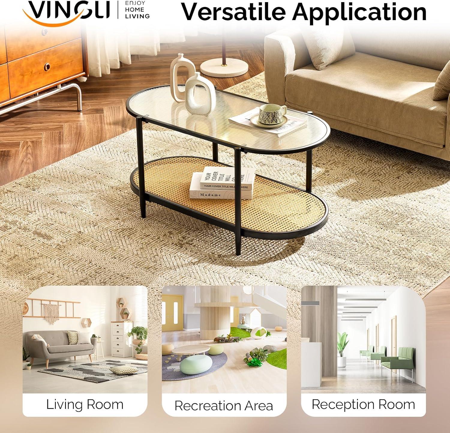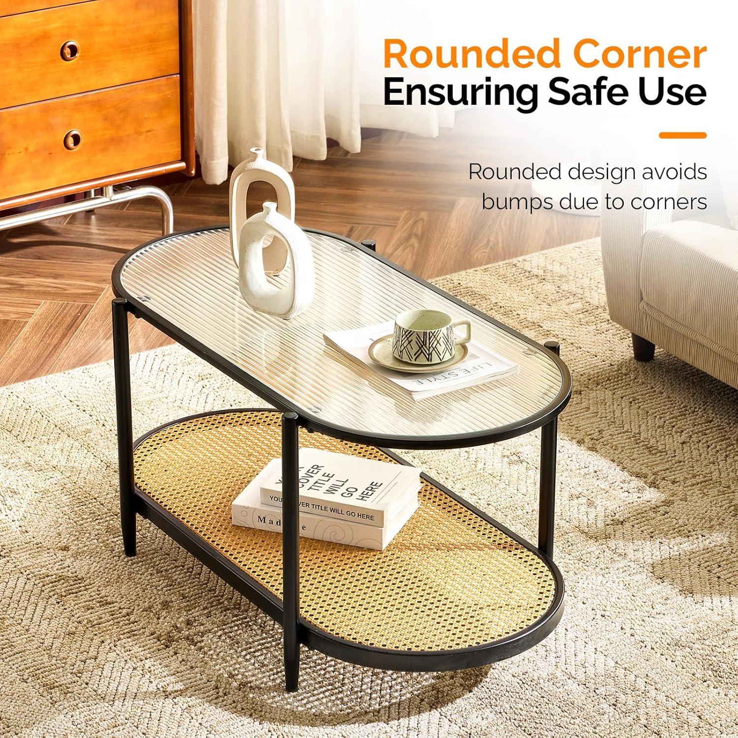 VINGLI 25.6″ Small Matte Black Round Coffee Table Water-Wave Glass Circle Clear Coffee Table, Center Table with 2-Tier Modern Storage Design for Living Room, Bedroom, Meeting Room, Balcony, Patio(Glass-oval Rattan Black)