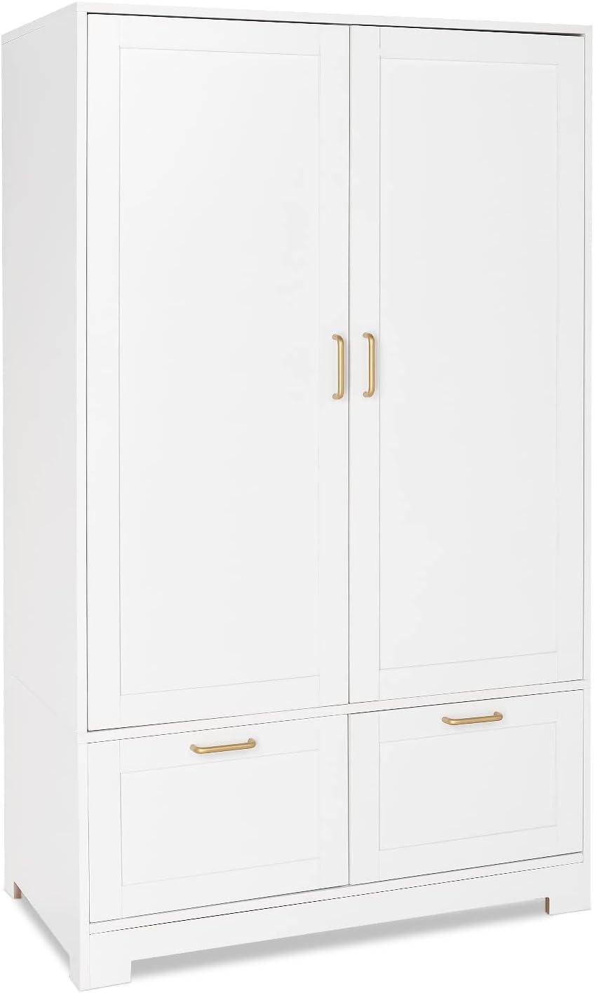 【Versatile Design】The VINGLI wardrobe armoire features a stylish white woodgrain finish, gold metal handles, and frame panel doors, making it a perfect fit for various home decoration styles such as modern, contemporary, farmhouse, or casual