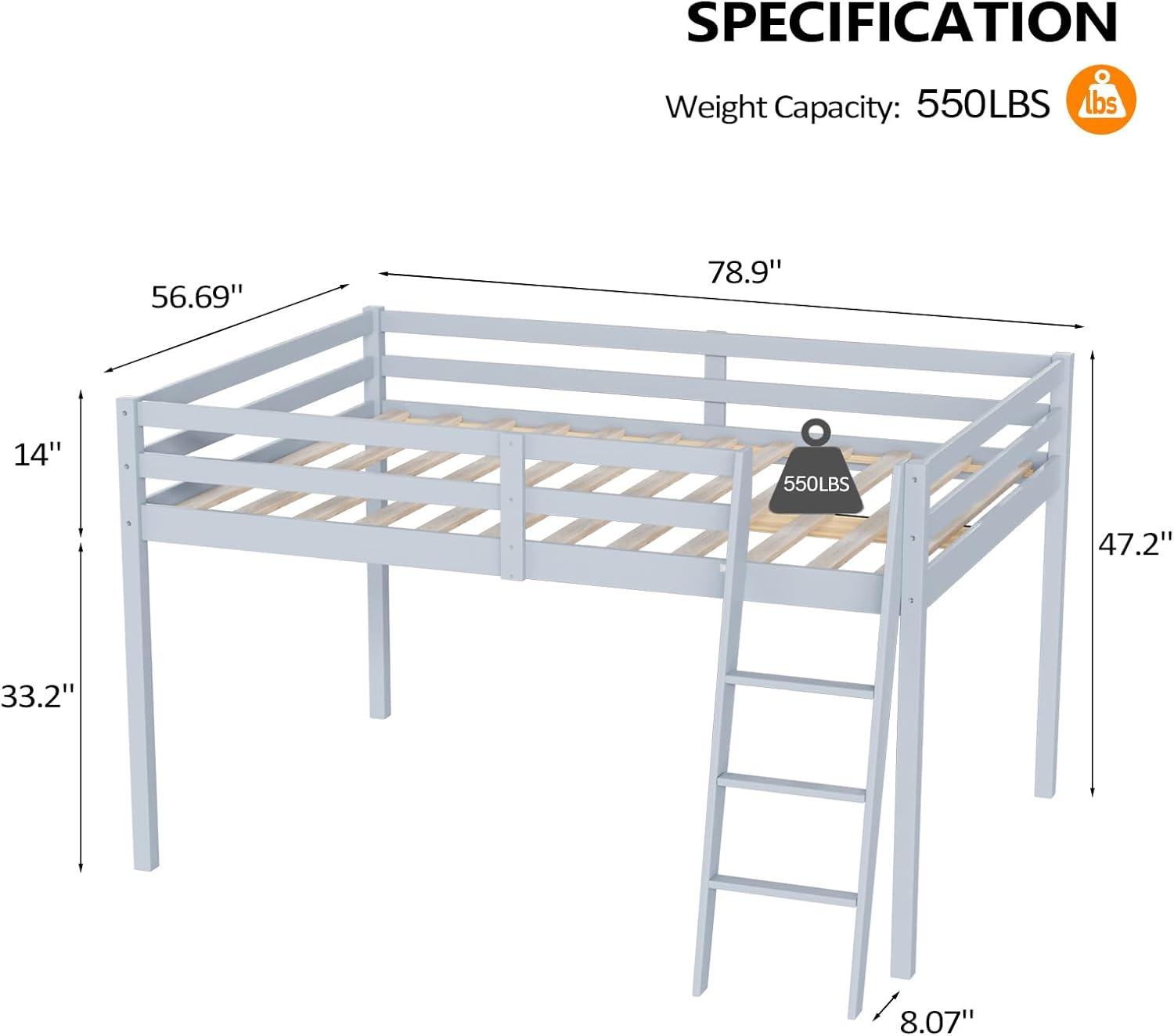 【Solid & Sturdy Bed Frame】Constructed by 100% solid pine wood with white paint finish, this kids loft bed features 1 center beams, full-length guardrail and wood slat support, all these enhance this full loft bed load capacity to 400 LBS