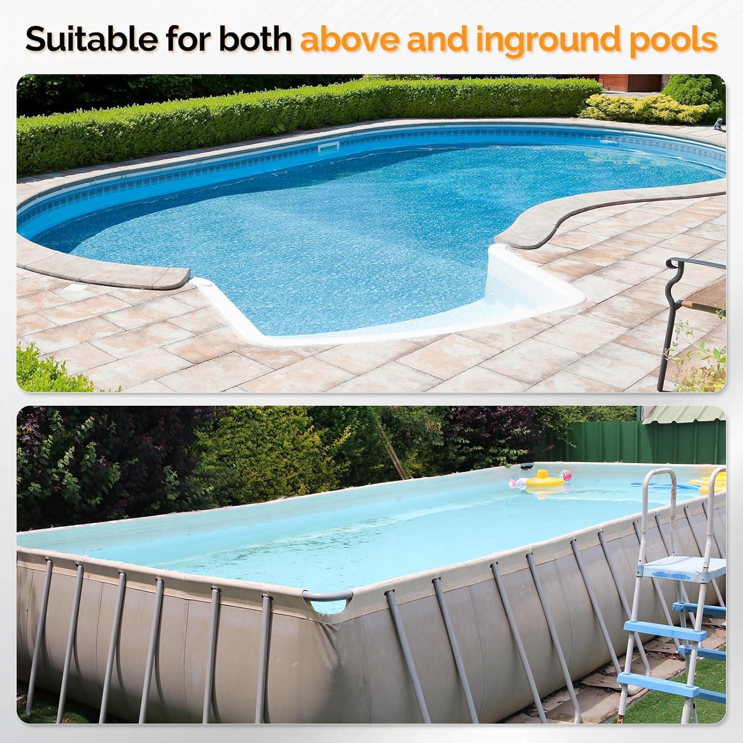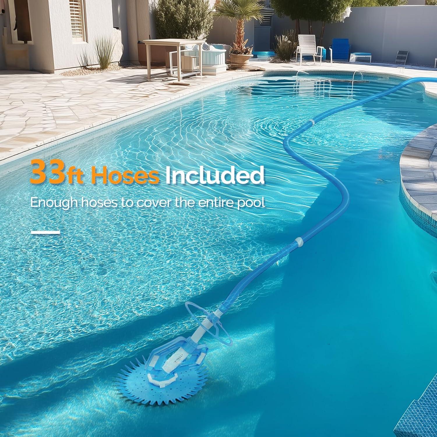 Great Suction Power and Can't Stuck, This automatic pool cleaner for in-ground pools thoroughly cleans swimming pools including the walls! This pool vacuum canefficiently remove dirt, debris. Wheel Deflector for movement around tight corners.Scuff-resistant Long-Life Hoses eliminate scuffs on all pool surfaces.