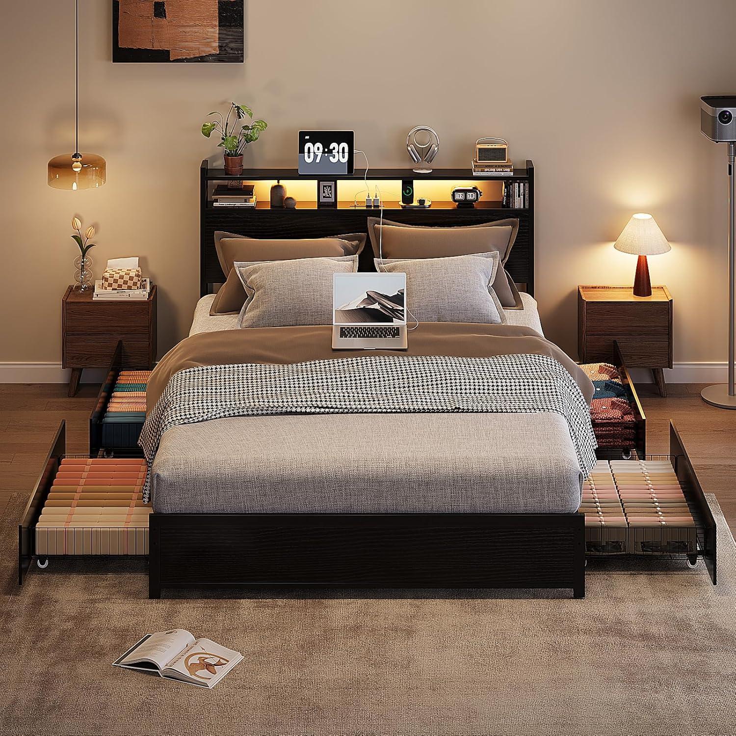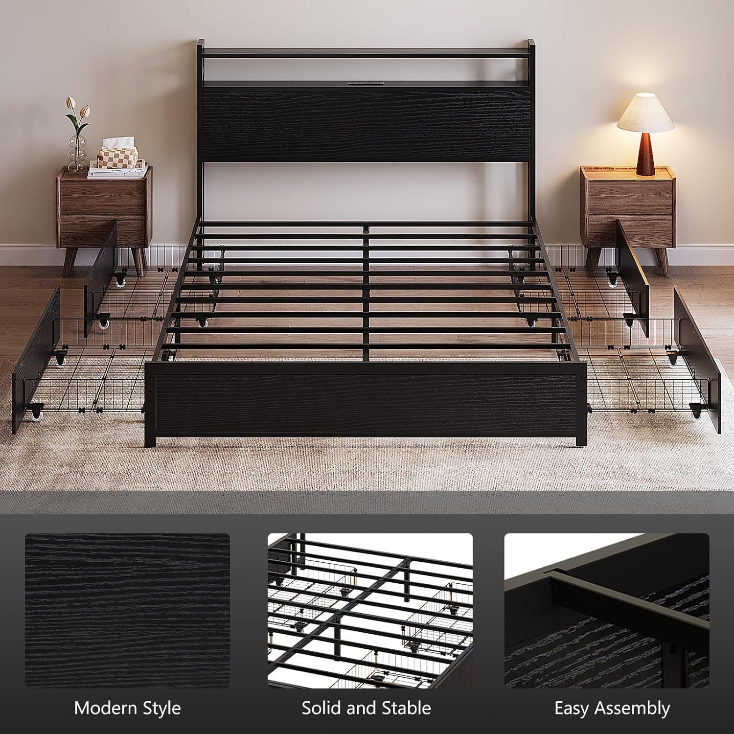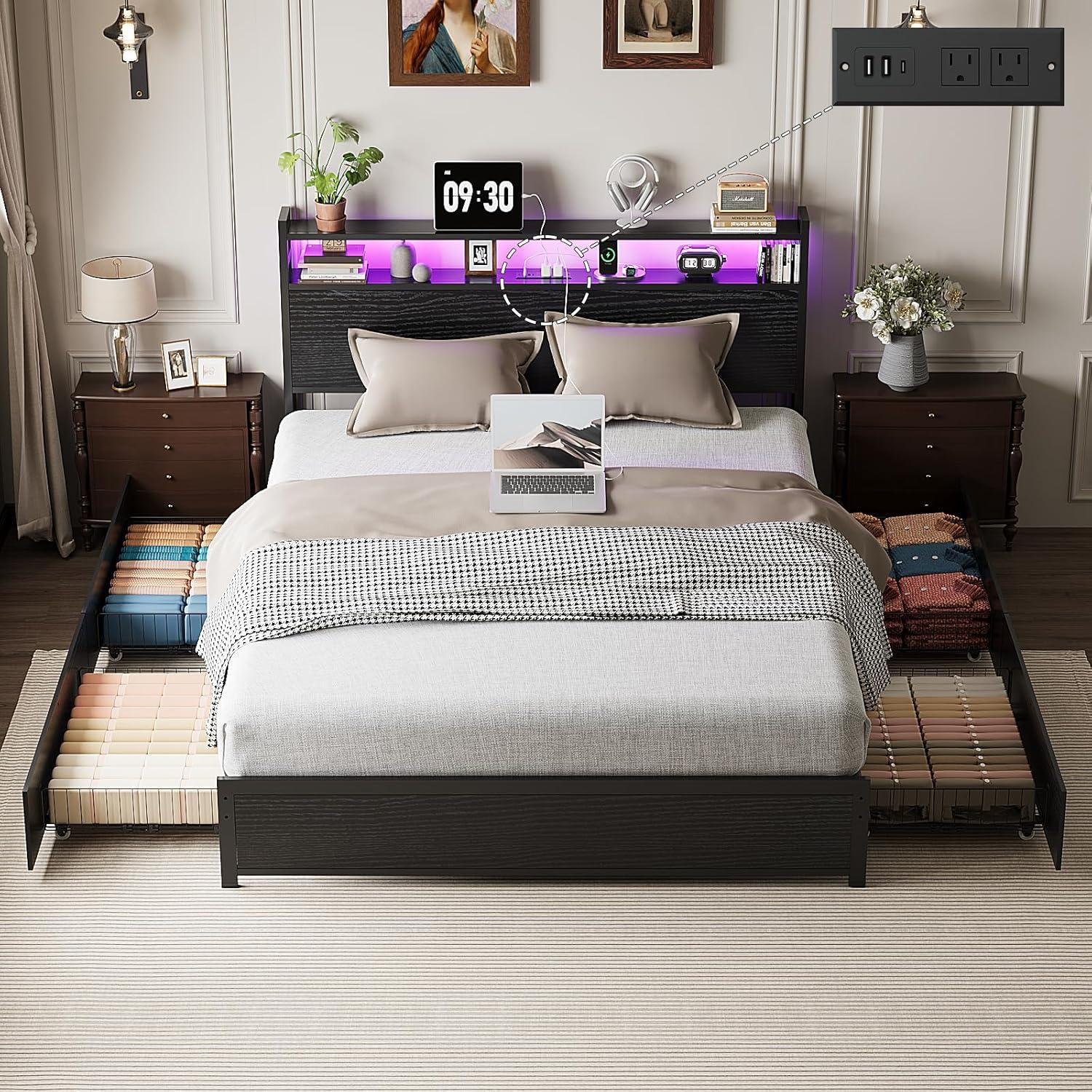 VINGLI Queen Bed Frame with 4 Storage Drawers and Headboard, Metal Platform Bed with Charging Station and RGB LED Lights, No Box Spring Needed, Noise Free, Easy Assembly, Vintage Brown(Black)