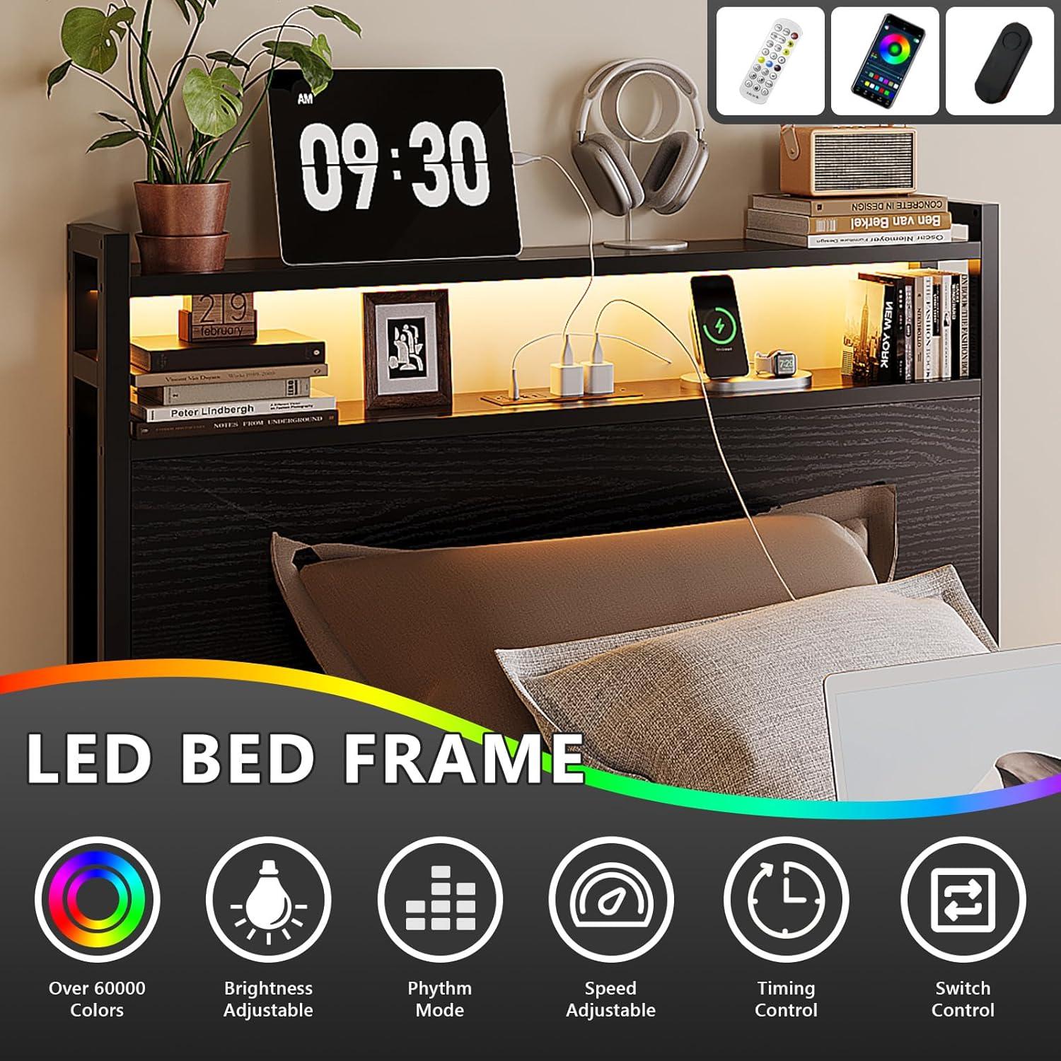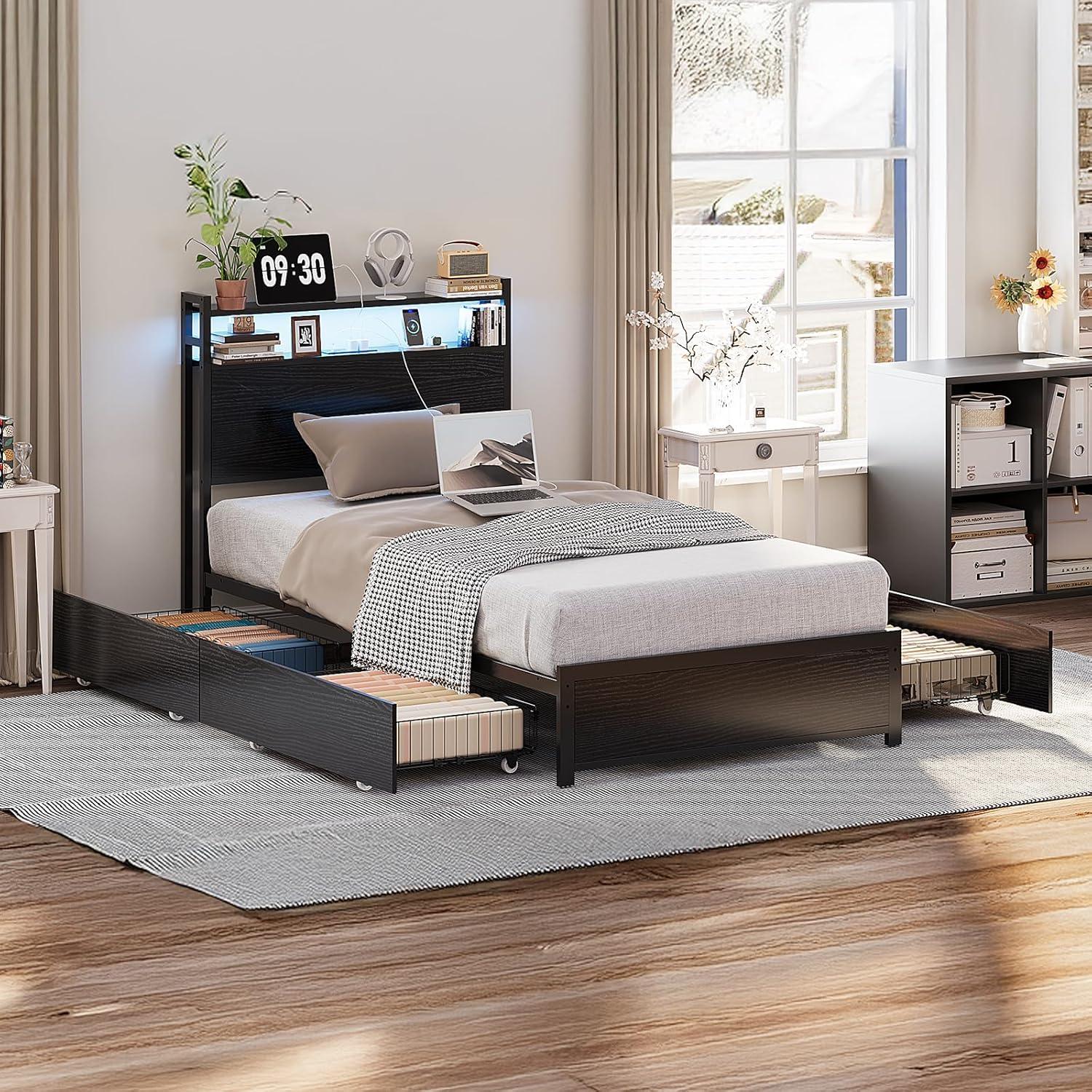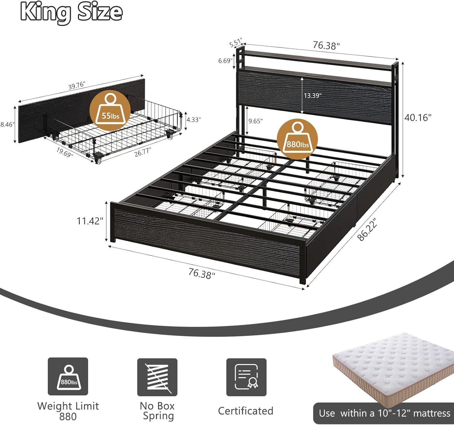 VINGLI Queen Bed Frame with 4 Storage Drawers and Headboard, Metal Platform Bed with Charging Station and RGB LED Lights, No Box Spring Needed, Noise Free, Easy Assembly, Vintage Brown(Black)
