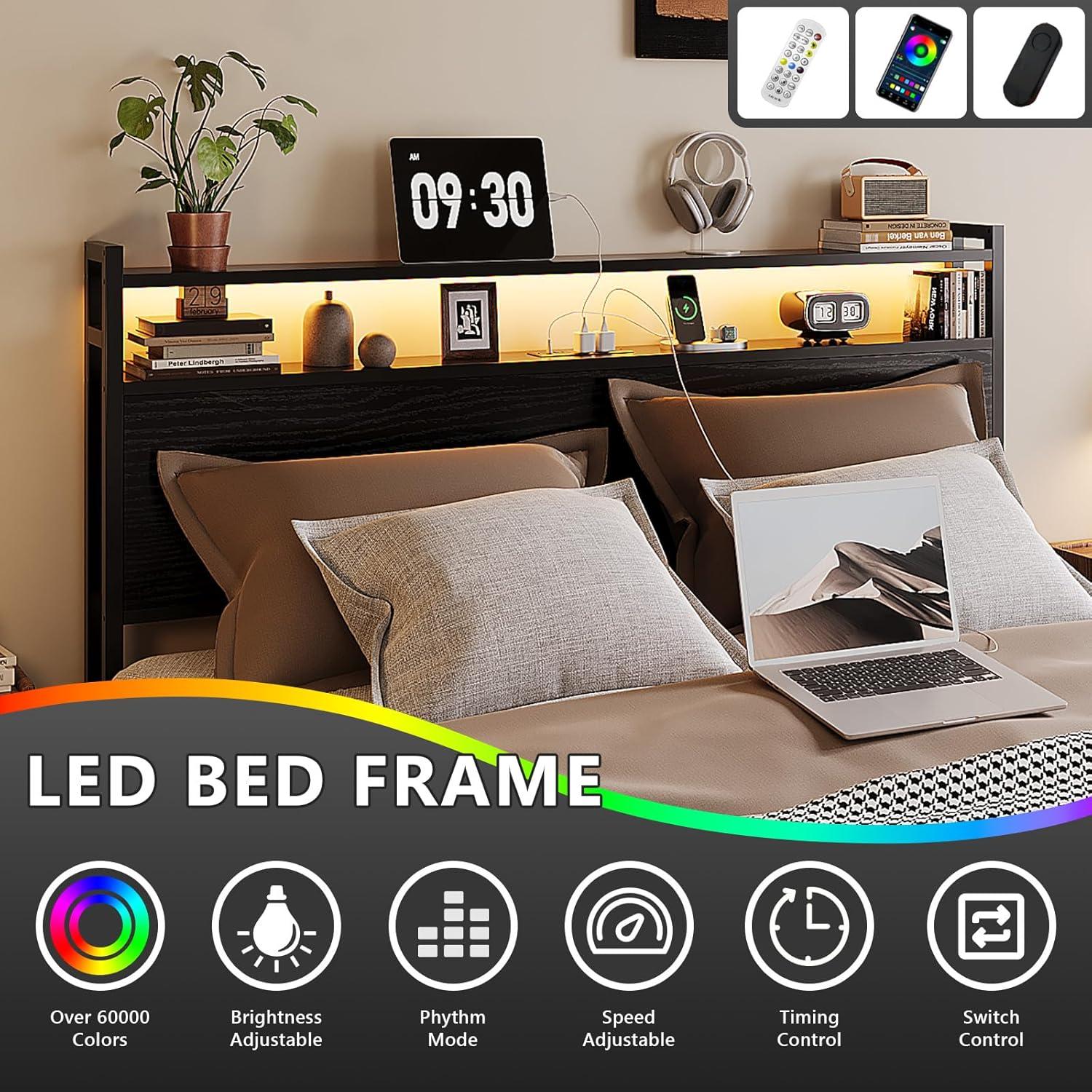 【RGB LED Lights】 The metal queen bed with LED lights features RGB light strips with 6000+ colors, brightness levels, scene modes, and music sync. Control via remote, mobile app and switch to create cozy night light, reading ambiance, or fun party effects.