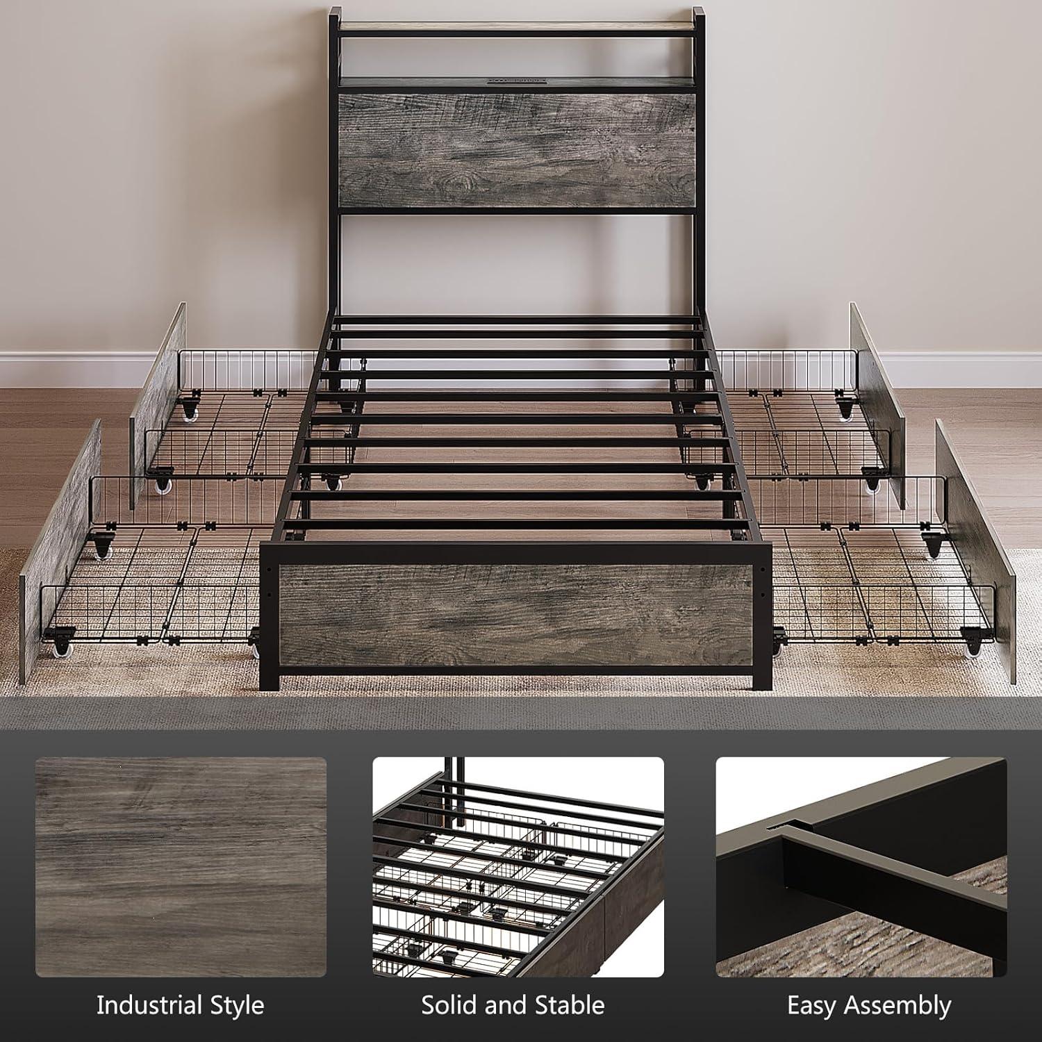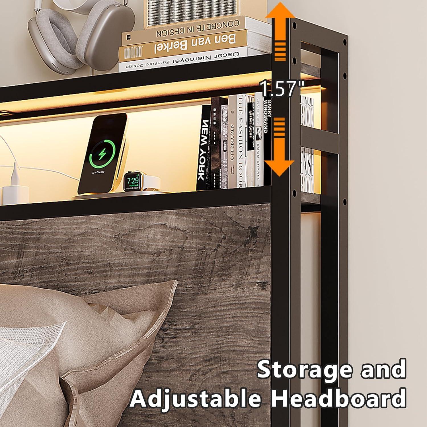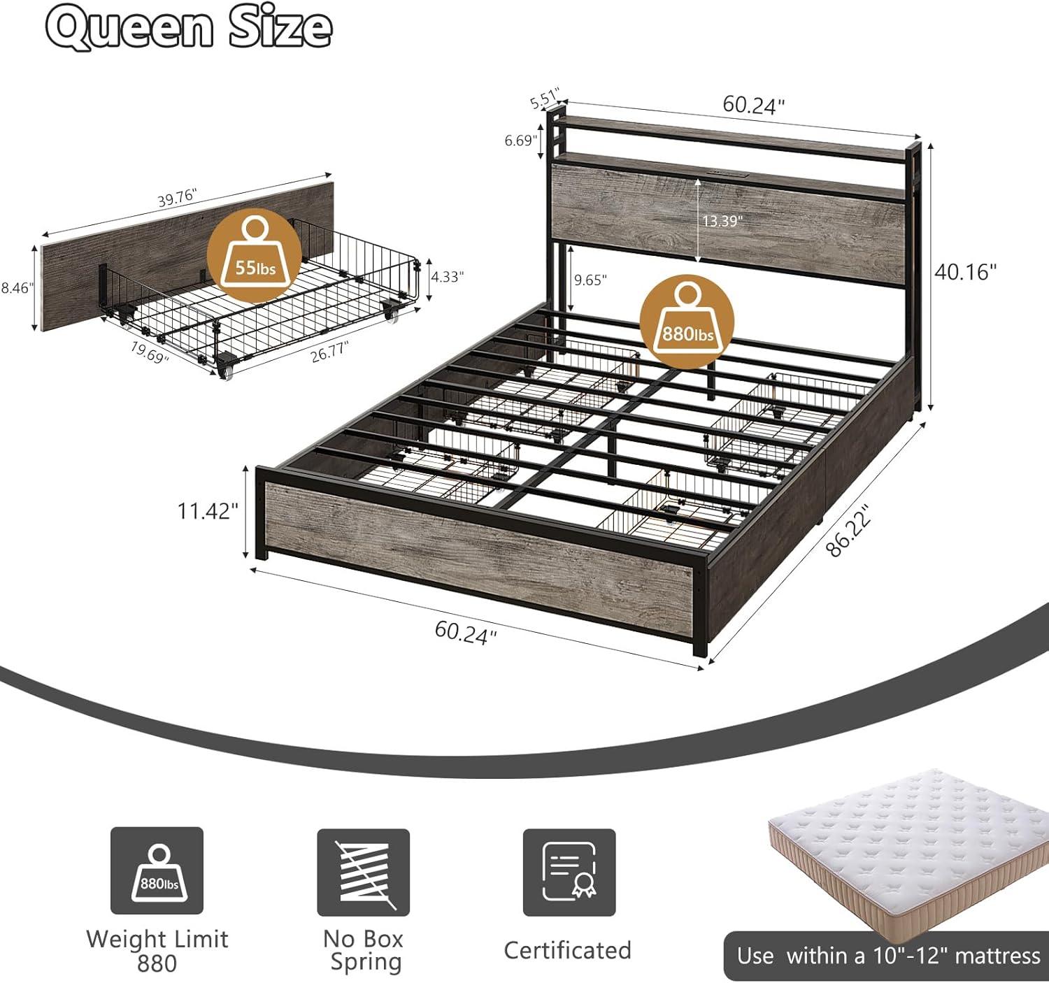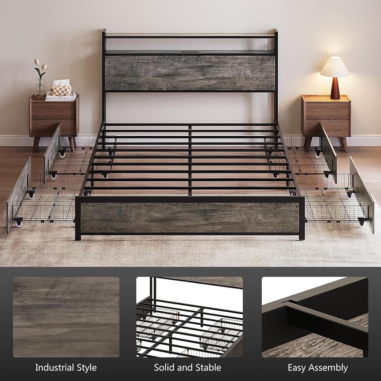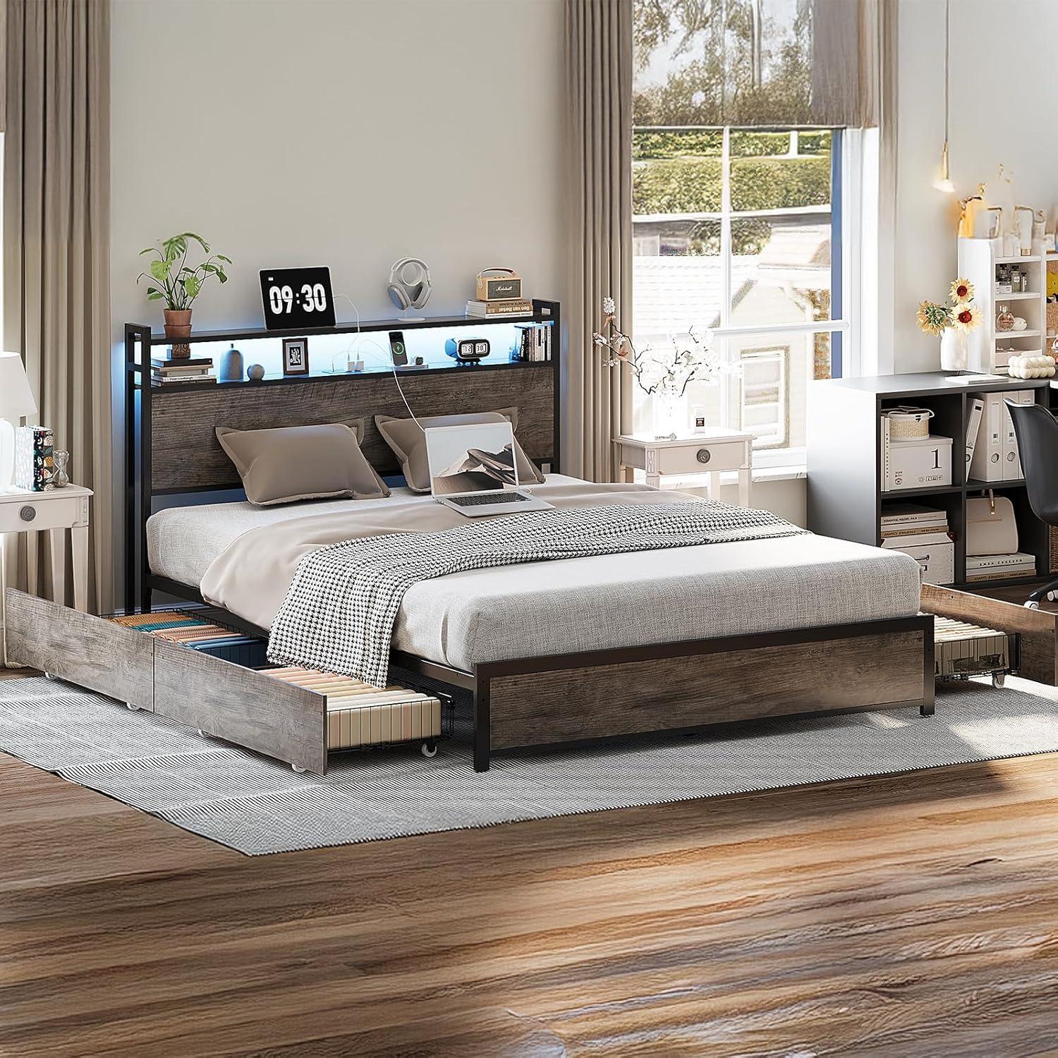 VINGLI Queen Bed Frame with 4 Storage Drawers and Headboard, Metal Platform Bed with Charging Station and RGB LED Lights, No Box Spring Needed, Noise Free, Easy Assembly, Vintage Brown(Wash Grey)