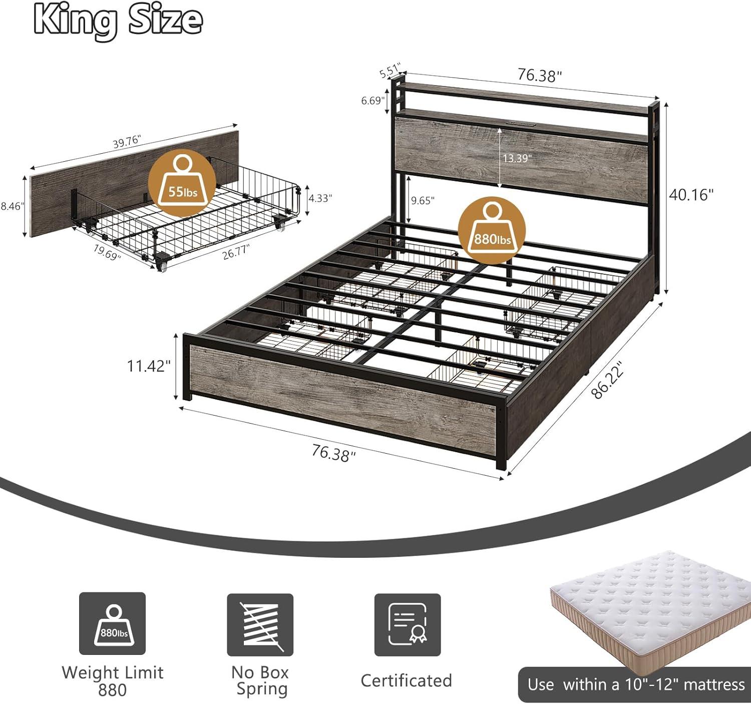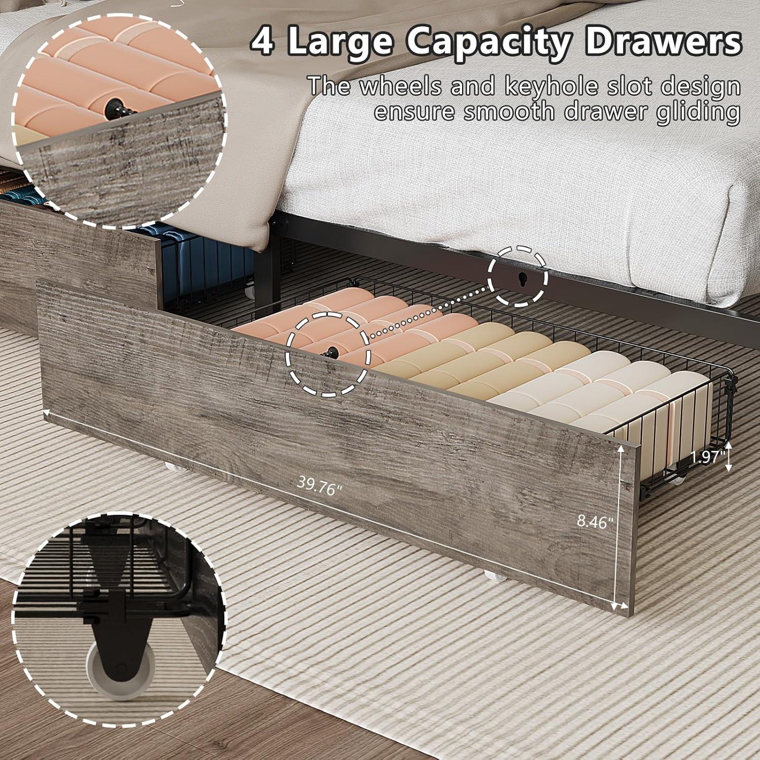 imageVINGLI Queen Bed Frame with 4 Storage Drawers and Headboard Metal Platform Bed with Charging Station and RGB LED Lights No Box Spring Needed Noise Free Easy Assembly Vintage BrownWash Grey