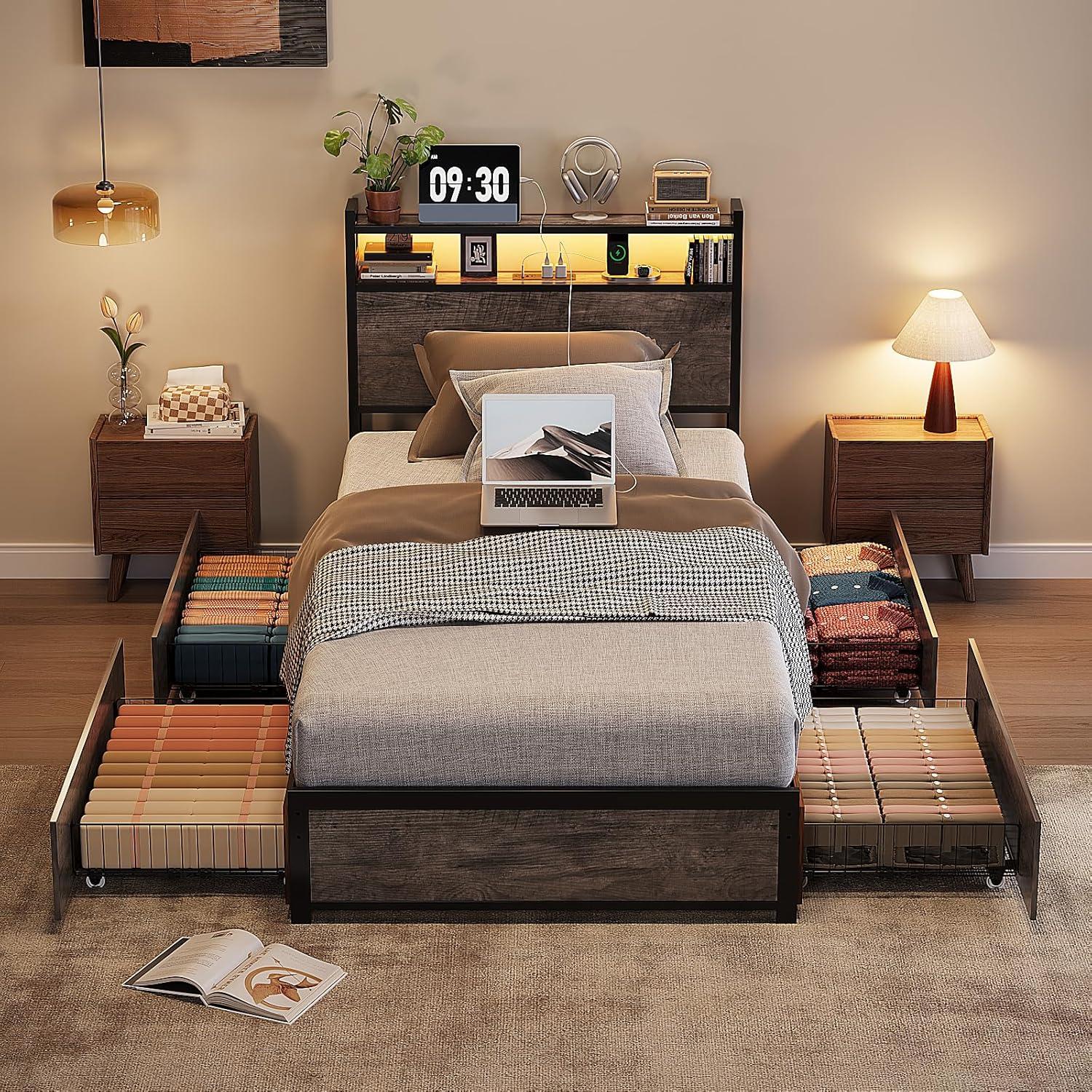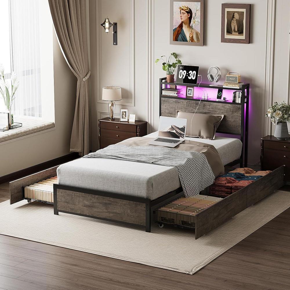 VINGLI Queen Bed Frame with 4 Storage Drawers and Headboard, Metal Platform Bed with Charging Station and RGB LED Lights, No Box Spring Needed, Noise Free, Easy Assembly, Vintage Brown(Vintage Brown)