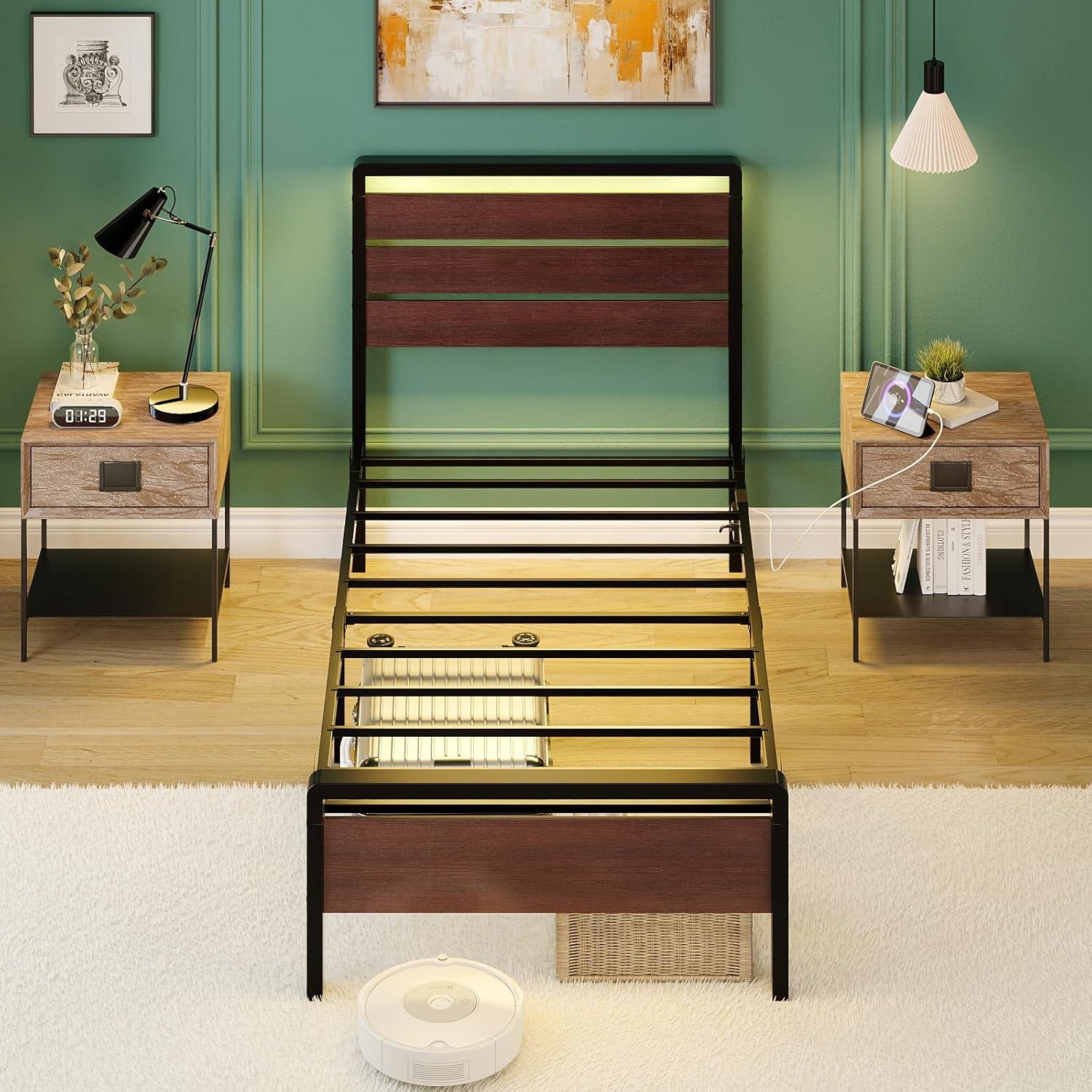 VINGLI Set of 2 Twin Bed Frames for Kids,Boucle Upholstered Platform Bed with Adjustable Headboard,Sturdy Wood Slats Support,Cloud Single Bed with Cream Design,Noise Free, Easy Assembly, Beige(Led Metal Industrial Brown)